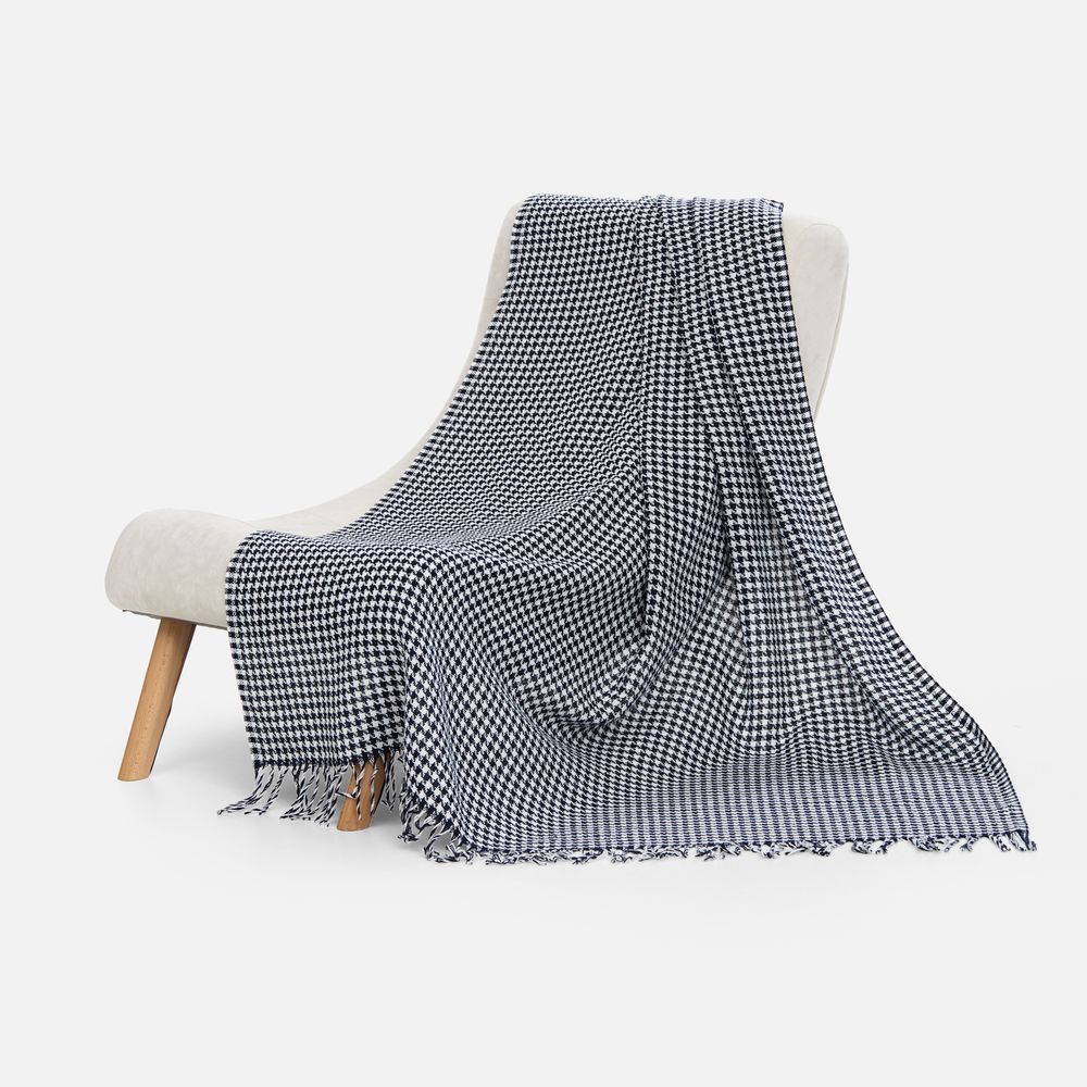 Графичный узор «гусиная лапка» (или «pied-de-poule») превращает изделие в изысканный интерьерный акцент, а бахрома добавляет ему элегантности и завершенности. Это воплощение безупречного вкуса и дань вневременной классике.