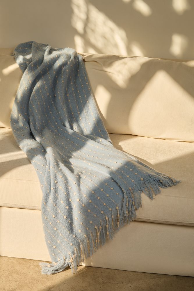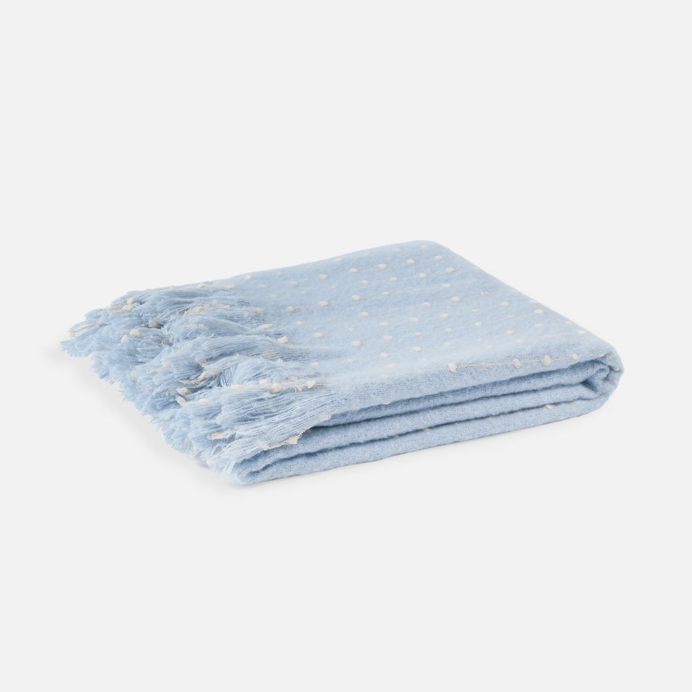 Изысканный плед небесно-голубого оттенка покоряет своим дизайном с первого взгляда. Особая текстура выпуклого узора в точку делает изделие не только визуально привлекательным, но и невероятно приятным на ощупь. Изящный пунктир, плавно переходящий на декоративную бахрому, придает пледу неповторимый шарм и элегантность.