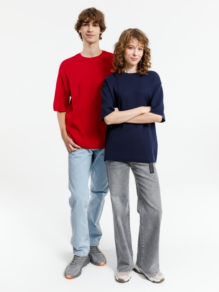 Siluetti Volumica — плотный вязаный джемпер-футболка прямого кроя с круглым вырезом и спущенной линией плеча. Фирменная бирка из силиконовой ленты станет интересной деталью, привлекающей внимание на фоне общей лаконичности модели.