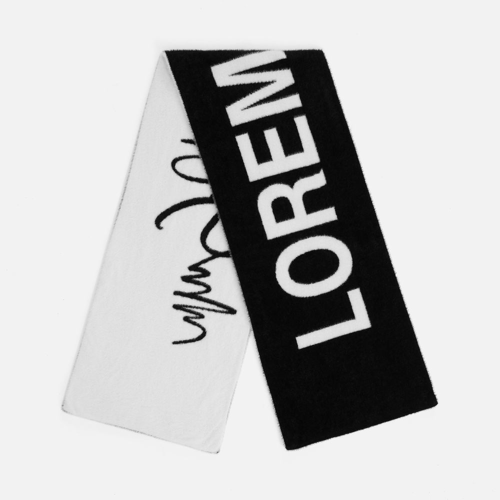 Шарф из пушистого нейлона с вывязанным логотипом и индивидуальным рисунком в черно-белой гамме.