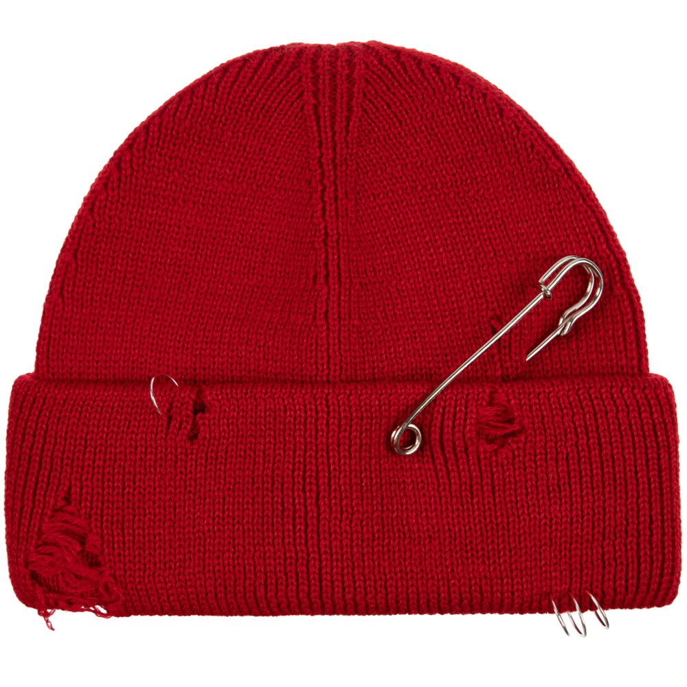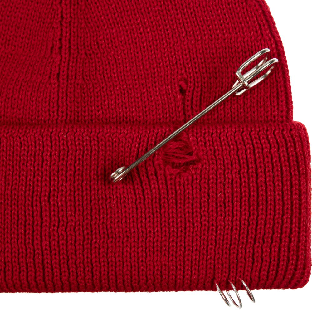Однослойная шапка бини с рваным отворотом и металлическими аксессуарами для дерзких образов в любом возрасте. Яркий и запоминающийся акцент в стиле гранж.