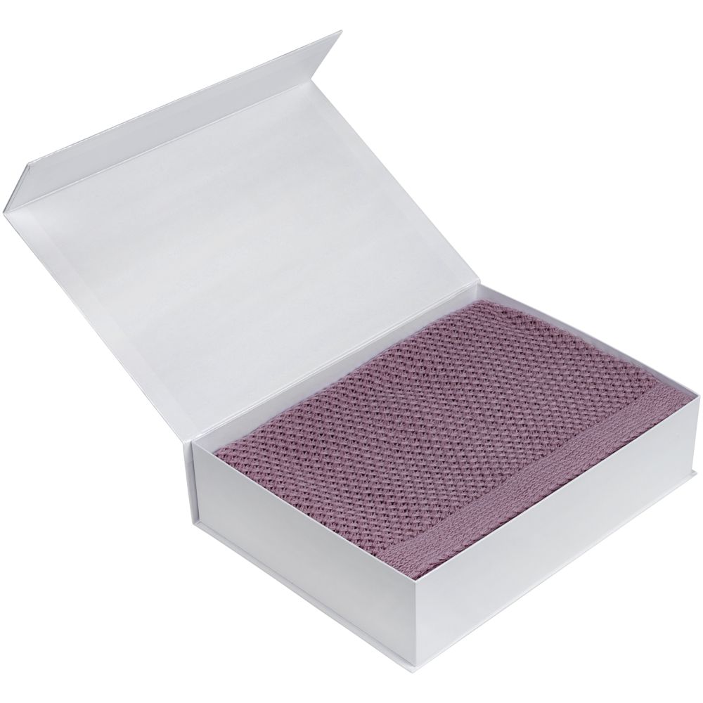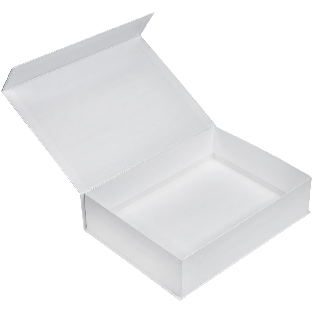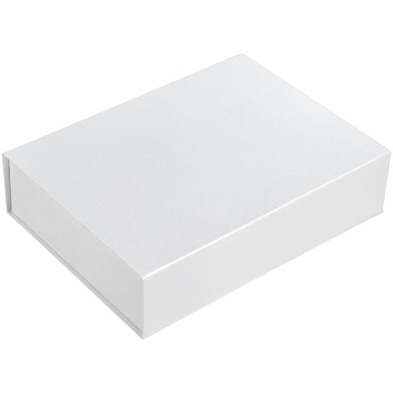 Коробка изготовлена из переплетного картона, кашированного дизайнерской бумагой Majestic цвета «Белый мрамор».