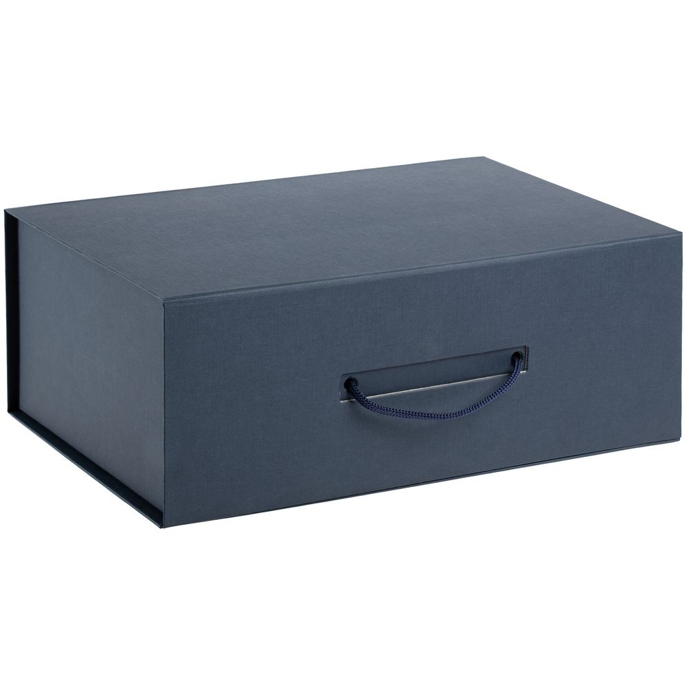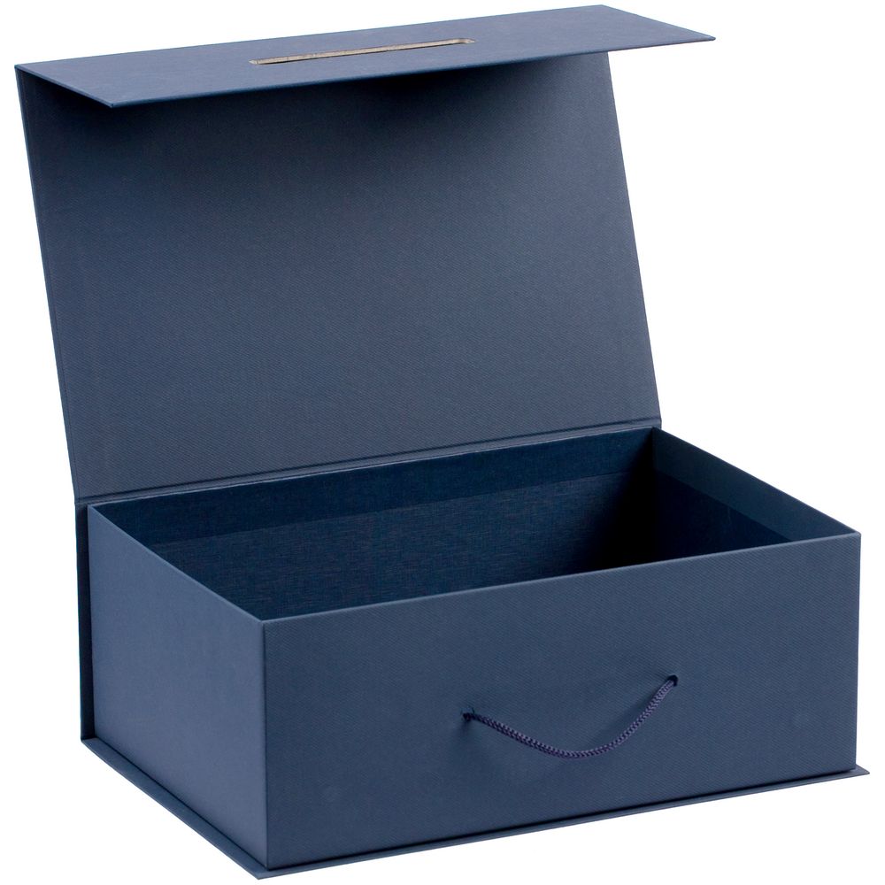 Коробка выполнена из переплетного картона, кашированного дизайнерской бумагой Malmero «Благородный синий», с крышкой на магните.
