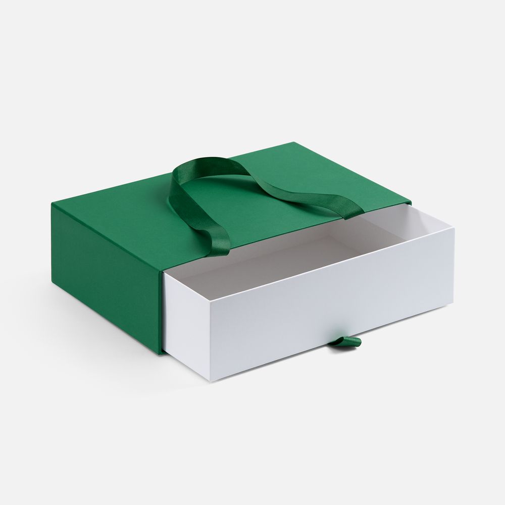 Внешний короб каширован дизайнерской бумаги и оснащен прочными ручками из репсовой ленты. Внутренний короб отделан белой бумагой, ламинированной матовой пленкой.