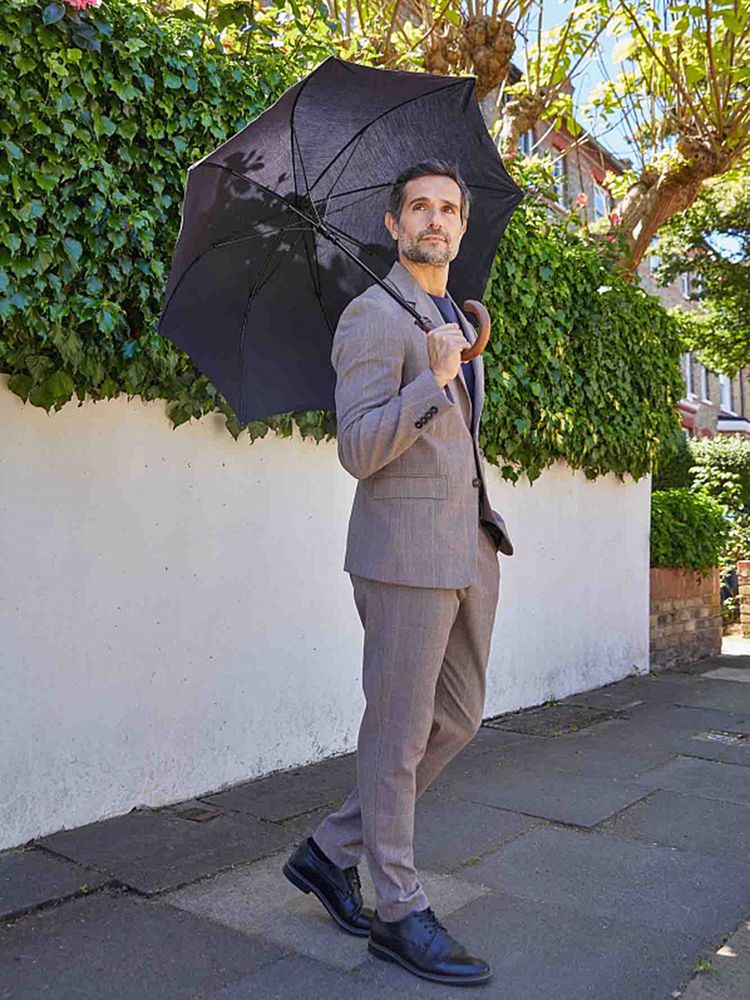 Большой фактурный купол сделан из люксового поликоттона, который очень красиво и необычно смотрится на свету. Деревянная рукоятка с металлическим кольцом, под которое заправляются спицы, добавляет аксессуару престижа и изящества.